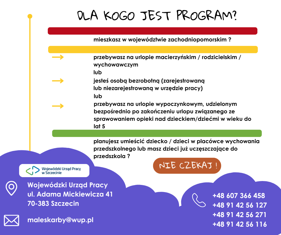 Głównym celem projektu jest wsparcie rodziców dzieci w wieku przedszkolnym, mieszkających na terenie województwa zachodniopomorskiego, w powrocie na rynek pracy / podjęciu zatrudnienia.